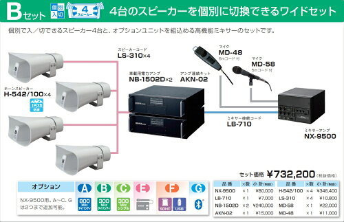 拡声器 300W 選挙用車載アンプハイパワーセットB 12V H-542/100×4 LS-310×4 NB-1502D ×2 AKN-02 LB-710 NX-9500 MD-58 MD-48