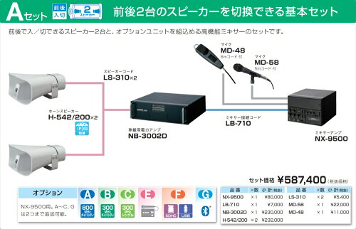 【セット内容】・H-542/200(防滴形ホーンスピーカー)×2・LS-310(スピーカーコード)×2・NB-3002D(パワーアンプ)・LB-710(ミキサー接続コード)・NX-9500(ミキサーアンプ) ・MD-58(マイク) ・MD-48(マイク) お急ぎの方は事前に納期をご確認下さい。
